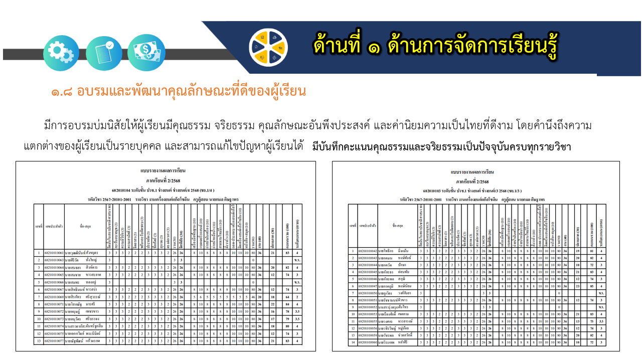ภาคเรียนที่ 1/2568 บันทึกคะแนนคุณธรรมจริยธรรม ตามรายวิชาที่สอน ดังนี้