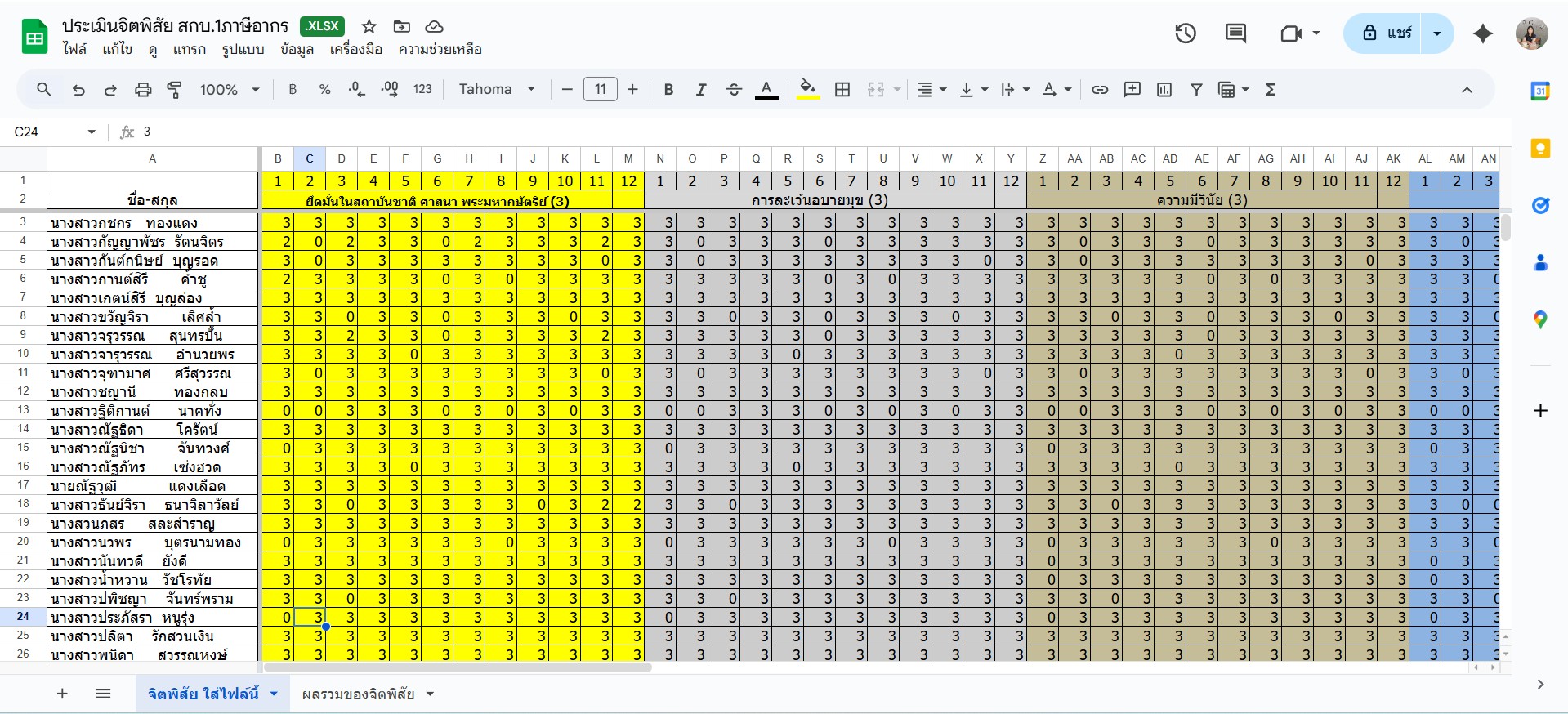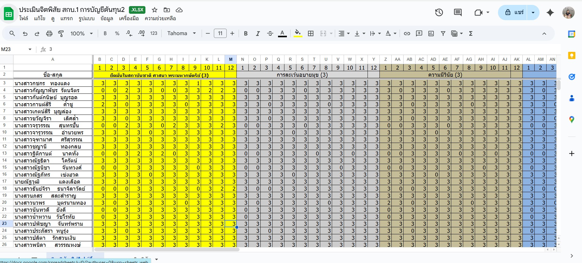 ►บันทึกคะแนนคุณธรรมและจริยธรรมวิชาโปรแกรมสำเร็จรูปเพื่องานบัญชี สกบ.1/1 (สอนสัปดาห์ที่ 10-12)
