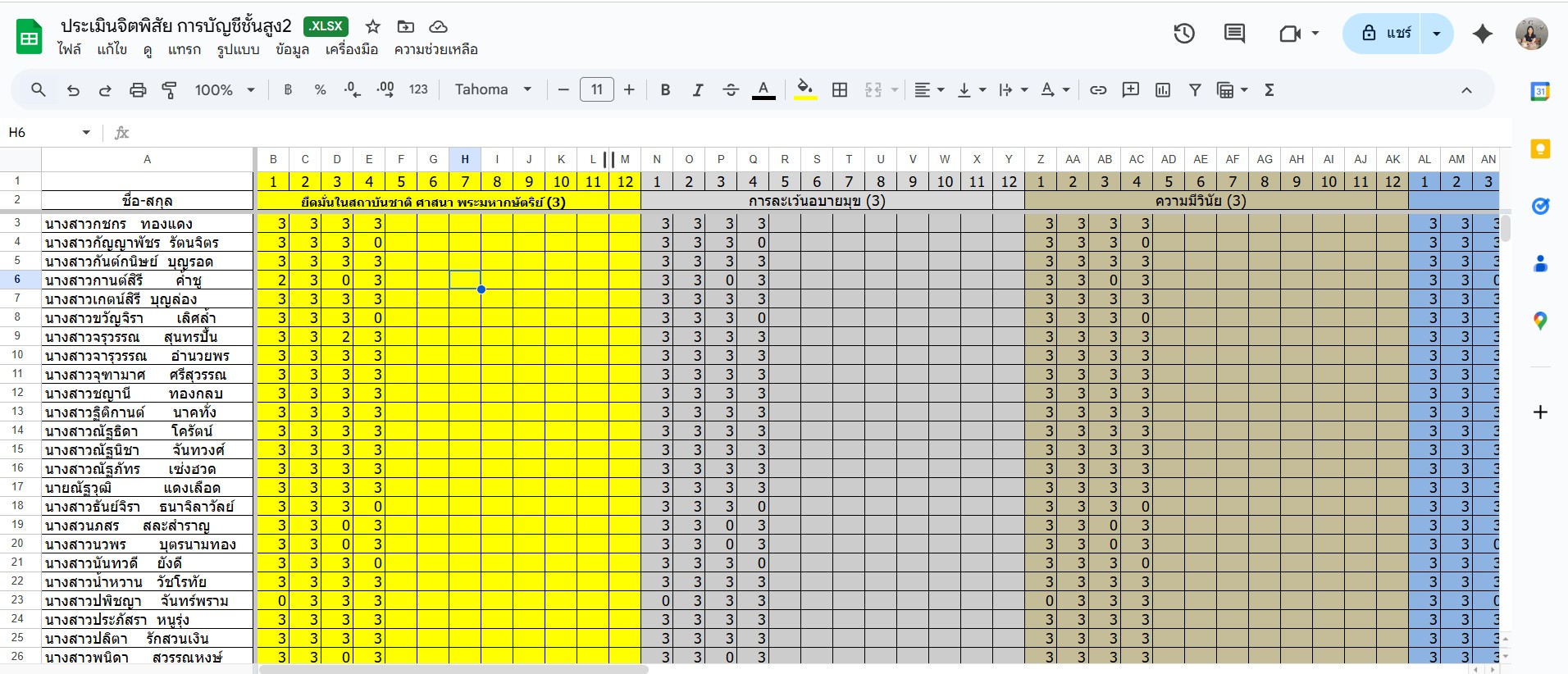 ►บันทึกคะแนนคุณธรรมและจริยธรรมวิชาการบัญชีต้นทุน 1 สกบ.1/1 (สอนสัปดาห์ที่ 6-8)